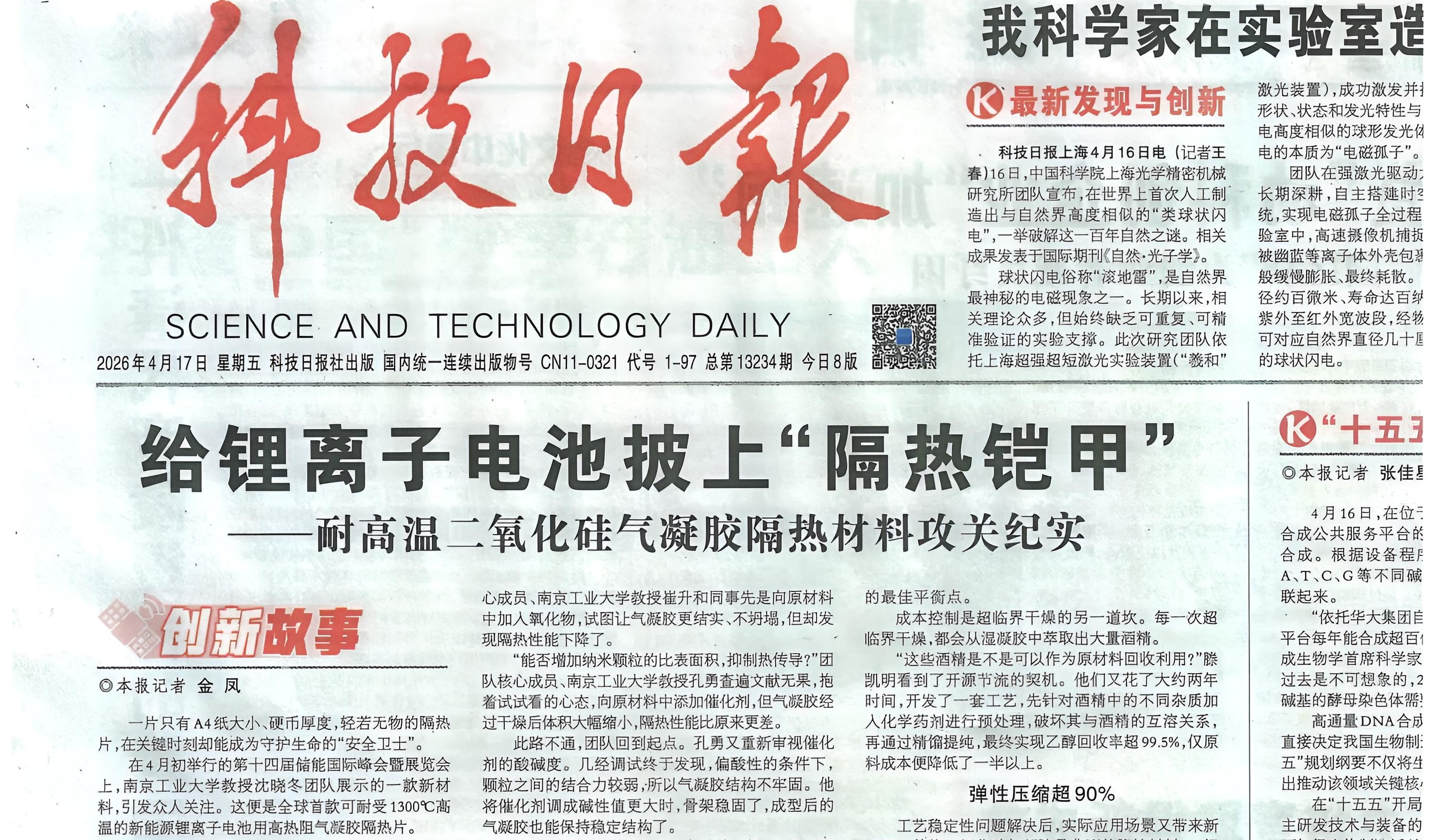 《科技日报》:给锂离子电池披上“隔热铠甲”——耐高温二氧化硅气凝胶隔热材料攻关纪实