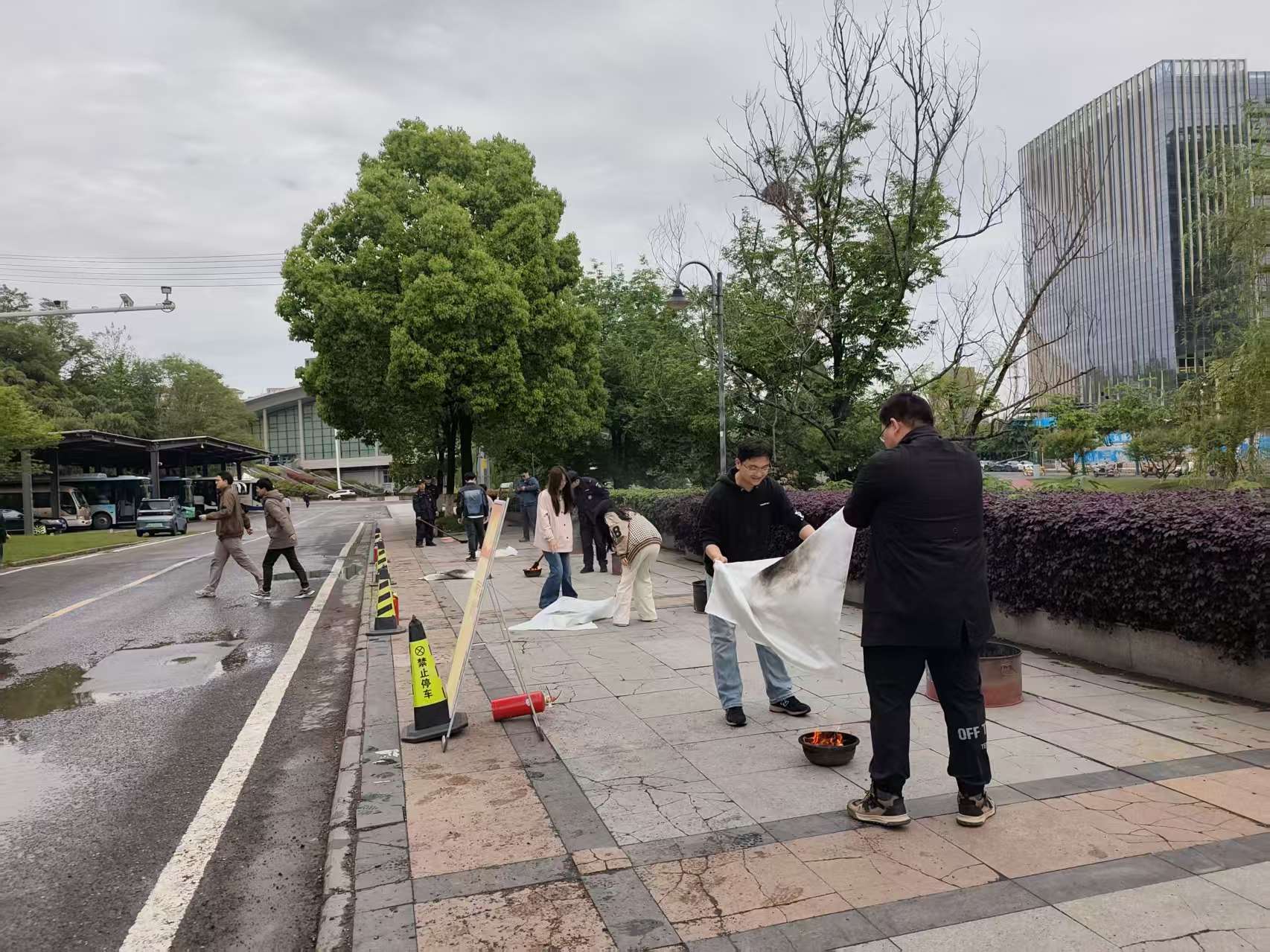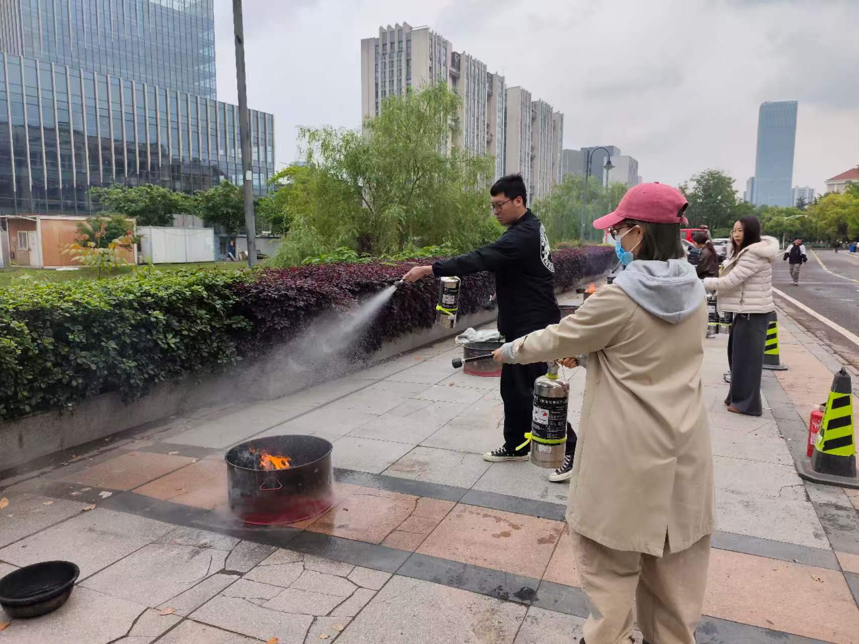 演练现场划分多个实训区,由保卫处专业安全员全程驻点指导,带领员工在模拟火场中依次完成灭火毯与灭火器实操。安全员针对灭火距离不足、喷射角度偏差、风向判断失误等常见问题进行了及时纠偏。面对熊熊烈焰,员工们轮番上阵,亲身体验真实火场环境下的器材操作。“只有在真实火场中练过‘提拔握压’,才算真正掌握了扑救初起火灾的关键技能!”一位参与演练的员工感慨道。