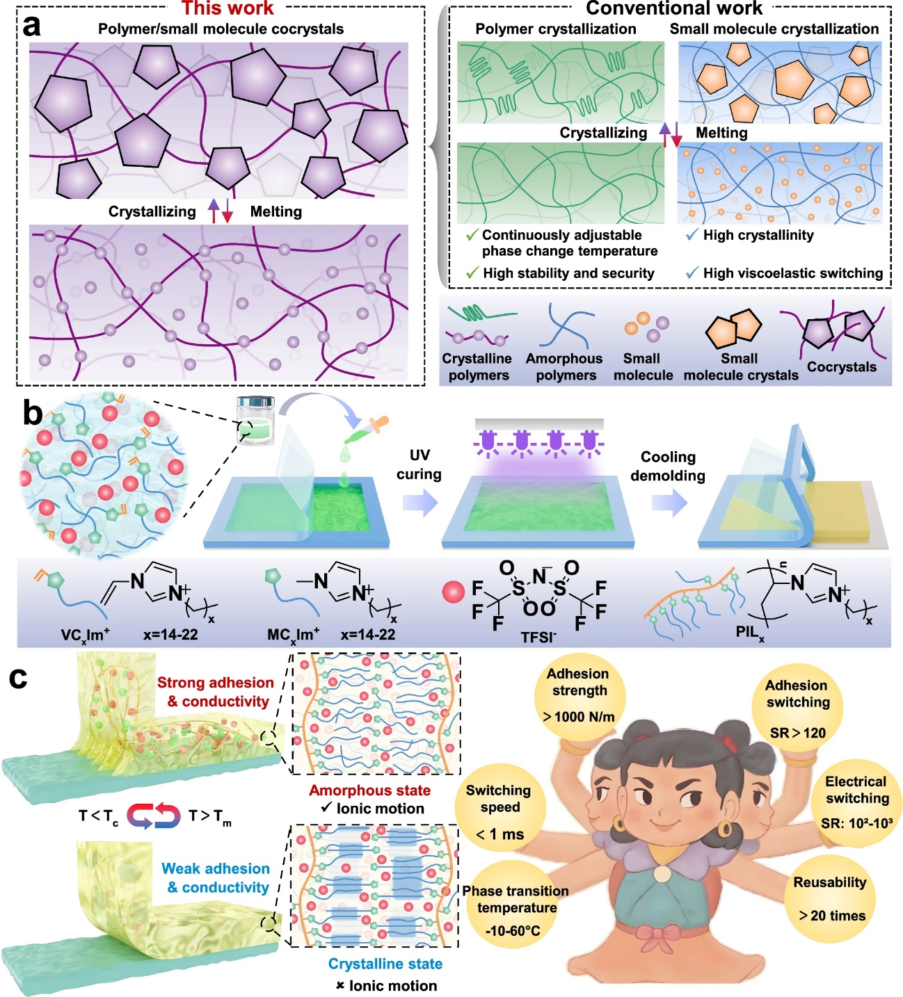 近日,bevictor伟德陈双俊教授和郑严博士团队与南京大学周东山教授、王晓亮教授等人合作,在智能粘附材料领域取得显著进展,相关成果以“Cocrystal effect-driven ultrafast phase-transitionionogelfor dynamically switchable adhesion interfaces”为题发表在《Nature Communications》上。论文通讯作者为王晓亮教授、周东山教授和陈双俊教授,第一作者为郑严博士。