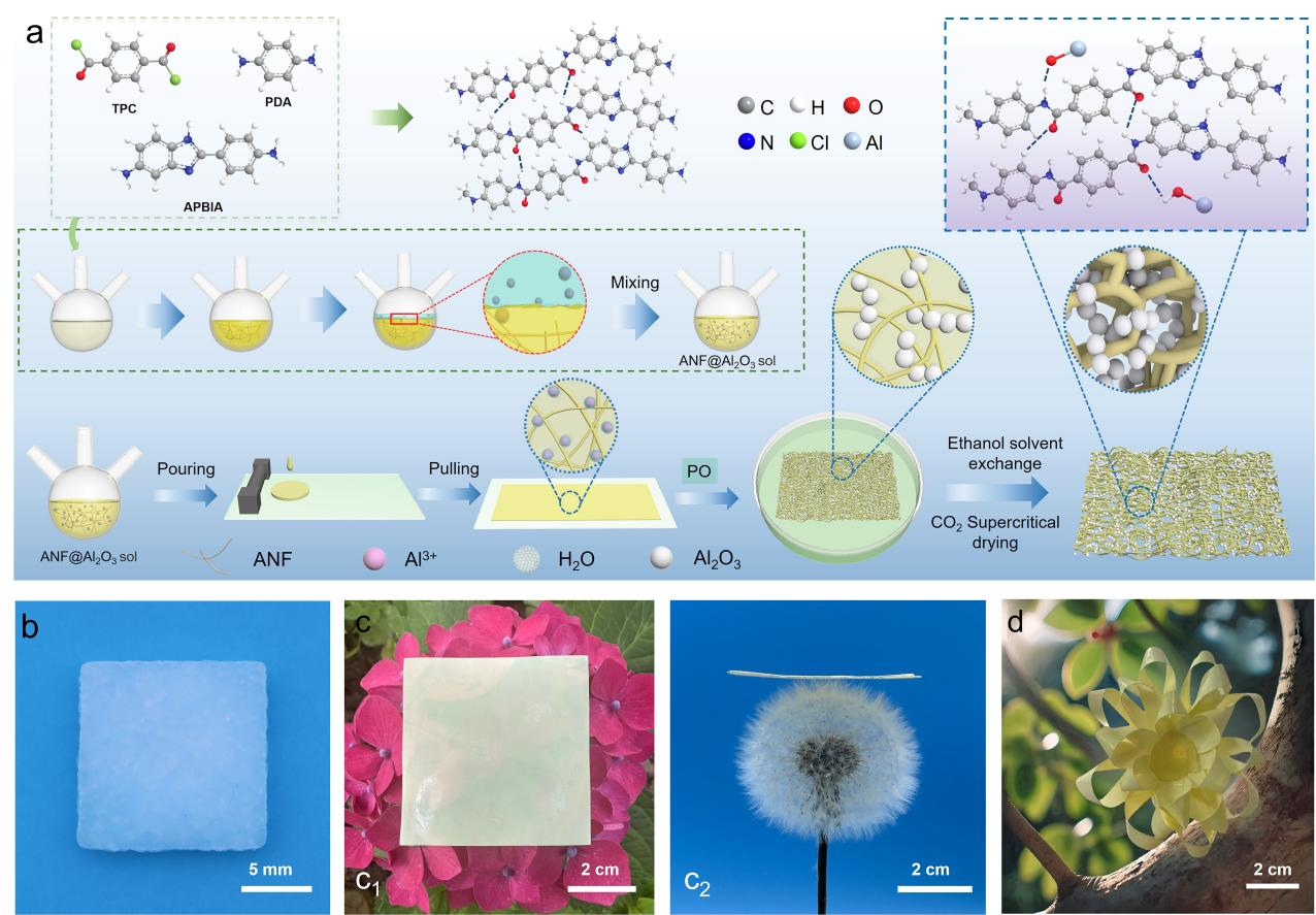 图1 a ANF @Al2O3-n合成过程的示意图,bAl2O3气凝胶的宏观外观,c薄膜状复合气凝胶置于花朵上的图像,d复合气凝胶形状可变形性的演示。