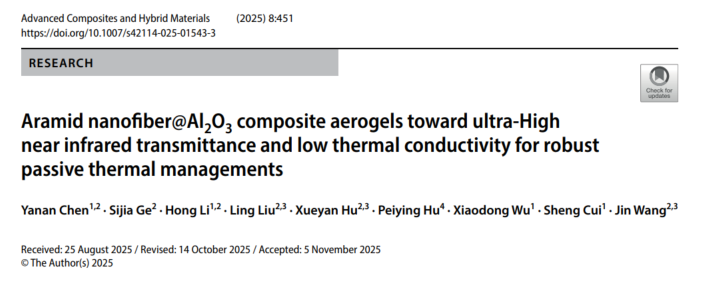 相关研究成果以“Aramid Nanofiber@Al2O3composite aerogels toward ultra-High near infrared transmittance and low thermal conductivity for robust passive thermal managements”为题发表于Advanced Composites and Hybrid Materials(IF=21.8)期刊上。
