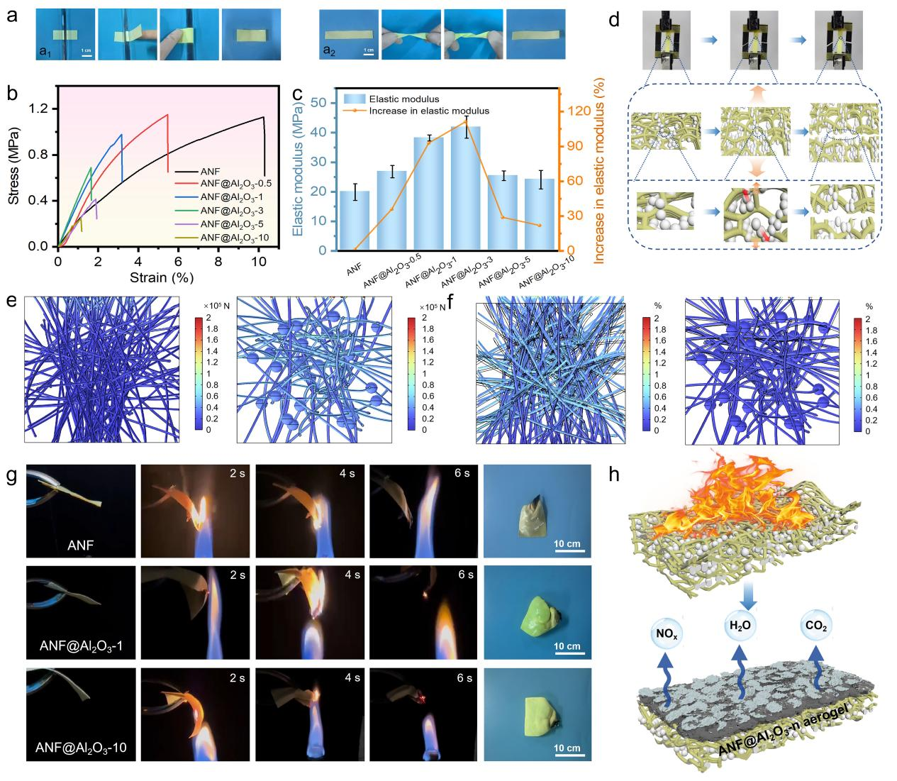 图3 a ANF@Al2O3的柔韧性演示,b应力-应变曲线,c弹性模量变化,d拉伸测试照片及显微结构示意图,e在相同100 N拉伸载荷下,ANF纤维结构(左)与ANF@Al2O3复合结构(右)的等效应力分布,f对应的等效应变分布,g ANF、ANF@Al2O3-1和ANF@Al2O3-10的阻燃性能测试,h阻燃机制。