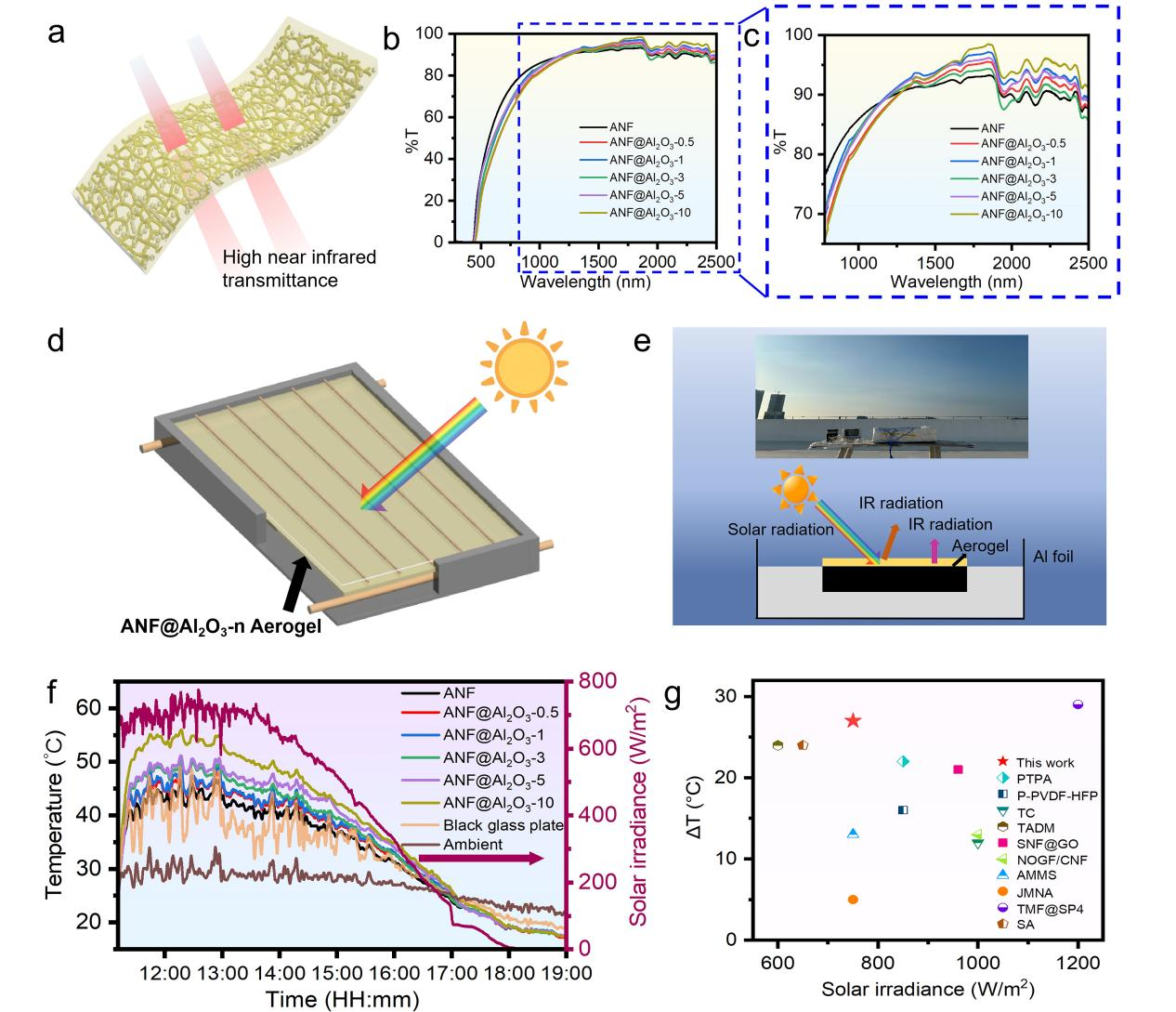 图5 a ANF@Al2O3近红外光透过示意图,b 380-2500 nm的透过率,c 750-2500 nm范围的放大光谱,d太阳能加热过程示意图,e太阳能辐射机制与测试装置示意图,f太阳能加热过程中的温度变化,g ANF@Al2O3与其他气凝胶基材料的太阳能加热能力对比。