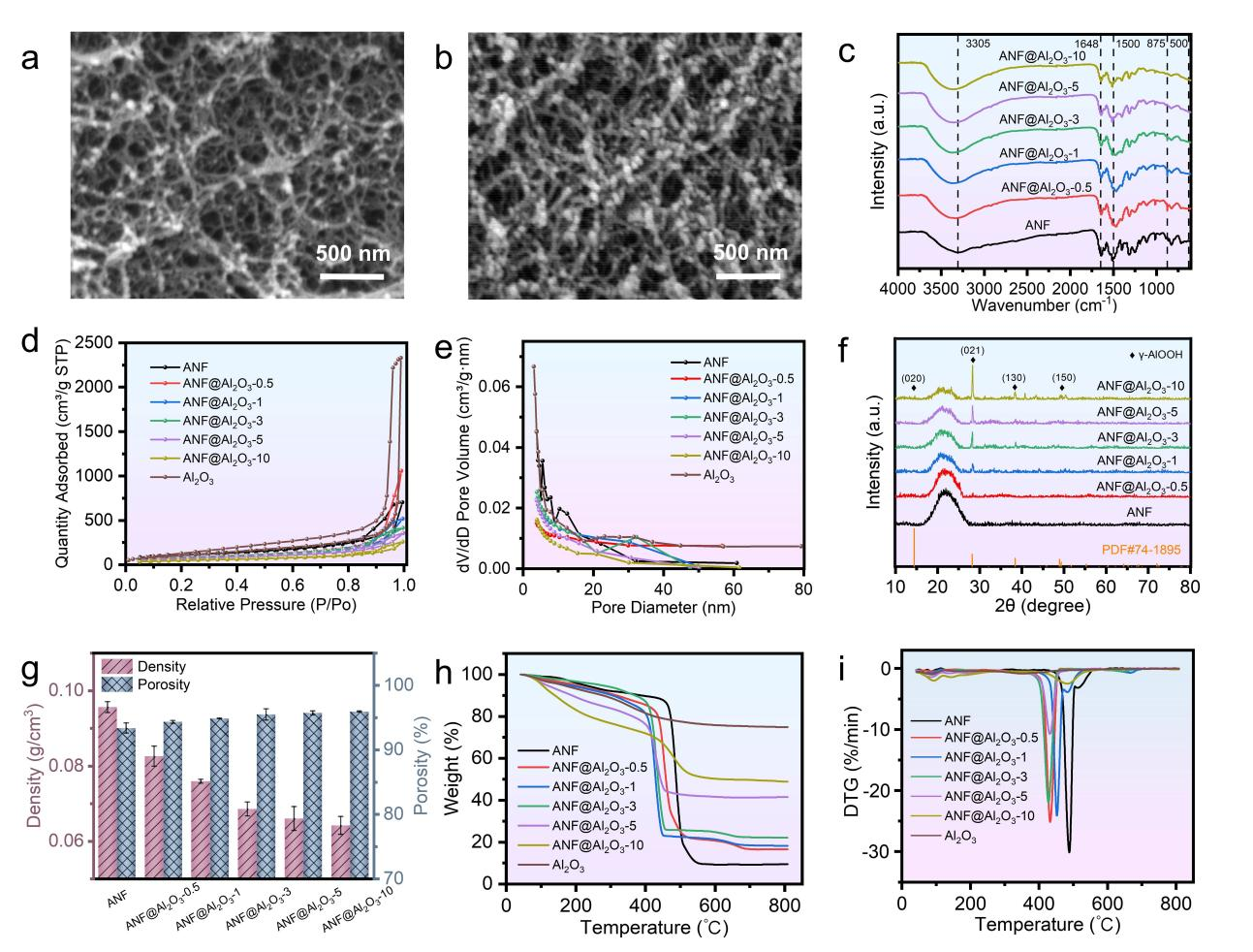 图2 a ANF的SEM,b ANF@Al2O3-10的SEM。c ANF @Al2O3的FT-IR,d N2吸附-脱附等温线,e BJH孔径分布曲线,f ANF @Al2O3的XRD图谱,g ANF @Al2O3的密度和孔隙率,h ANF @Al2O3的TG曲线,i ANF @Al2O3的DTG曲线。