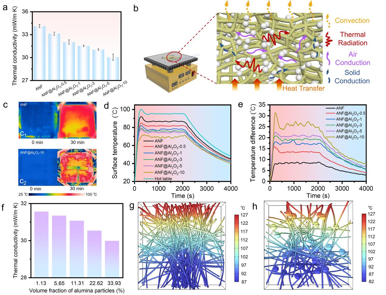 图4 a ANF @Al2O3的热导率,b热板加热装置及隔热机制的示意图,c加热30分钟后红外热像,d 100°C热台上加热过程中气凝胶的表面温度分布,e ANF和ANF@Al2O3表面相对于100°C热台的温差。f ANF@Al2O3复合材料在不同氧化铝颗粒体积分数下的理论热导率,g在127°C热边界条件下ANF气凝胶经过300 s传热模拟后的温度分布,h在相同模拟条件下ANF@Al2O3复合材料的温度分布。