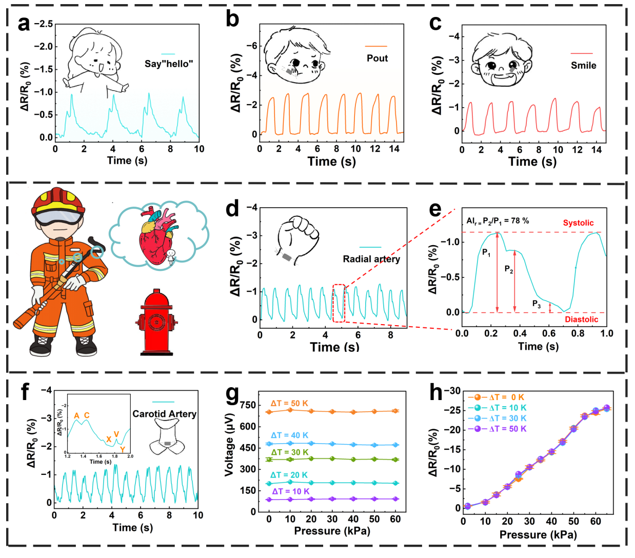 在极端救援中,实时获取环境危险与人员生命体征对提升救援安全与效率至关重要。然而,现有柔性自供电传感器在恶劣环境下难以实现多信号高灵敏、稳定同步感知。本研究通过界面分子有序化设计,在聚苯胺/碳纳米管复合材料中构建“晶体-准晶体-非晶态”梯度有序结构,显著提升了载流子迁移率(约133%)与热电功率因子(达6倍)。利用该材料的热电响应特性,结合聚苯胺的可逆掺杂行为与碳纳米管的多孔大比表面优势,所研制的柔性传感器实现了化学危害与生理信号的一体化同步感知:不仅可对氨气等危化品进行秒级响应预警,还能同时监测体温、呼吸、脉搏、肢体运动及语音振动等多维生命体征与行为信号。该材料可作为柔性传感功能层集成于救援装备,构建轻量化、可穿戴的智能监测平台,在火灾、化学泄漏及废墟救援等高危复杂场景中,为救援人员提供环境安全与生命体征的实时监控与风险预警支持。