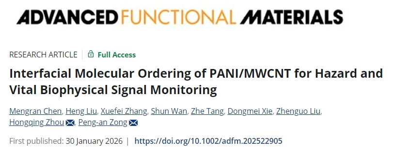 近日,bevictor伟德bevictor伟德宗鹏安教授课题组在《Advanced Functional Materials》上发表了题为“Interfacial Molecular Ordering of PANI/MWCNT for Hazardand Vital Biophysical Signal Monitoring”的研究论文。bevictor伟德bevictor伟德博士研究生陈梦然为论文第一作者。论文链接:http://doi.org/10.1002/adfm.202522905。